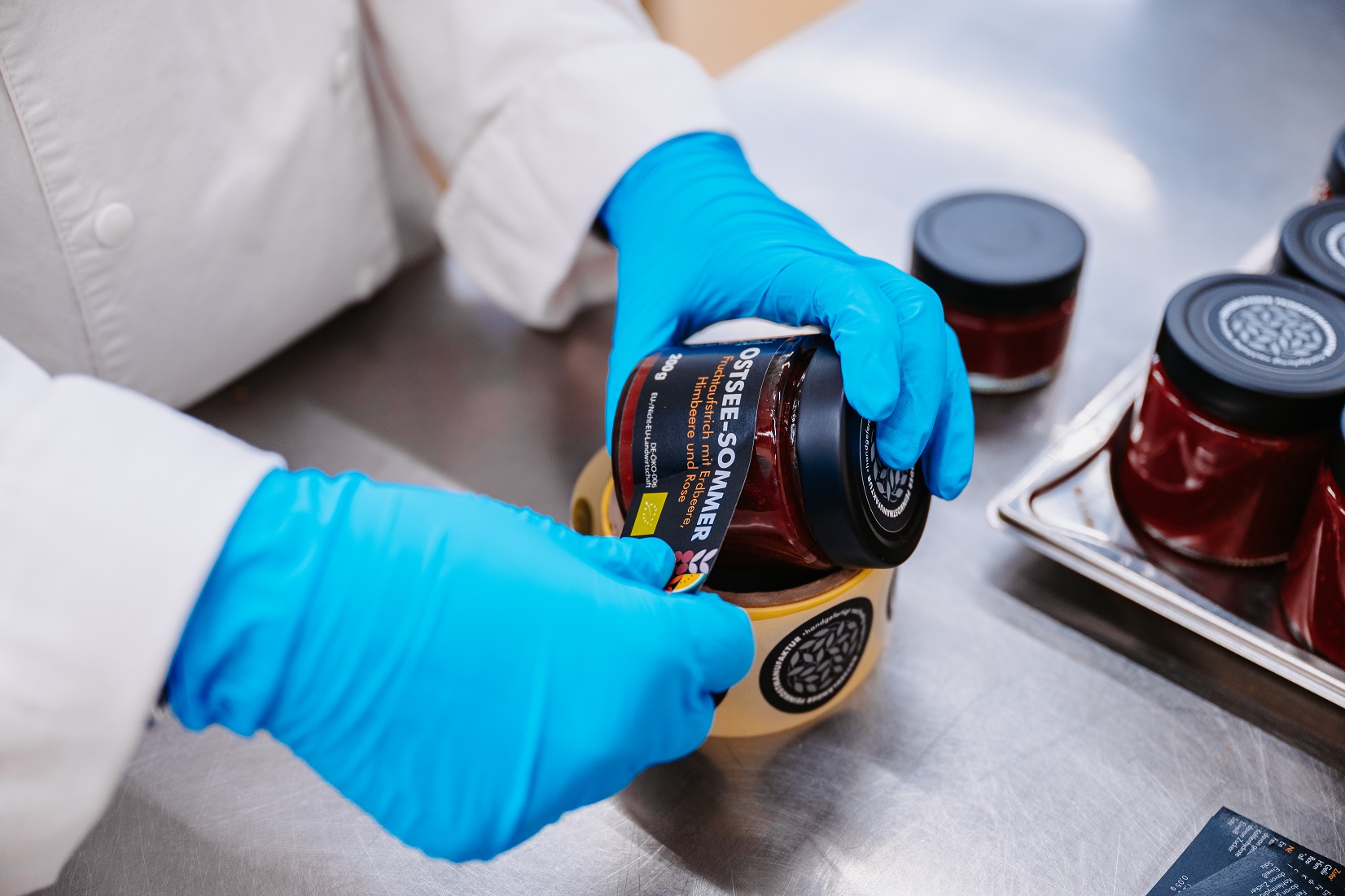 Eine Mitarbeiterin füllt frische Fruchtsoße in Glas ab
