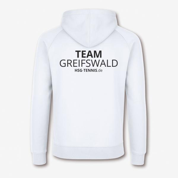- Rückseite: Optionaler Schriftzug „TEAM GREIFSWALD“ in Schwarz, ergänzt durch HSG-TENNIS.de in kleinerer Schrift.