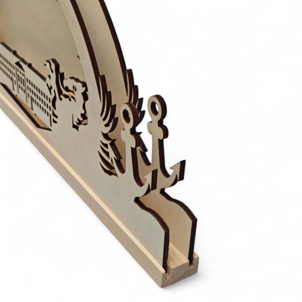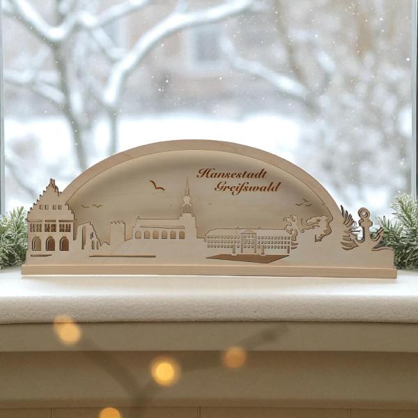 Dieser liebevoll gearbeitete Schwibbogen zeigt die charakteristische Silhouette der Hansestadt Greifswald – mit ihren markanten Bauwerken und maritimen Details wie Anker und Greif. Die feinen Konturen und der natürliche Holzton bringen das Stadtbild stilvoll zur Geltung.