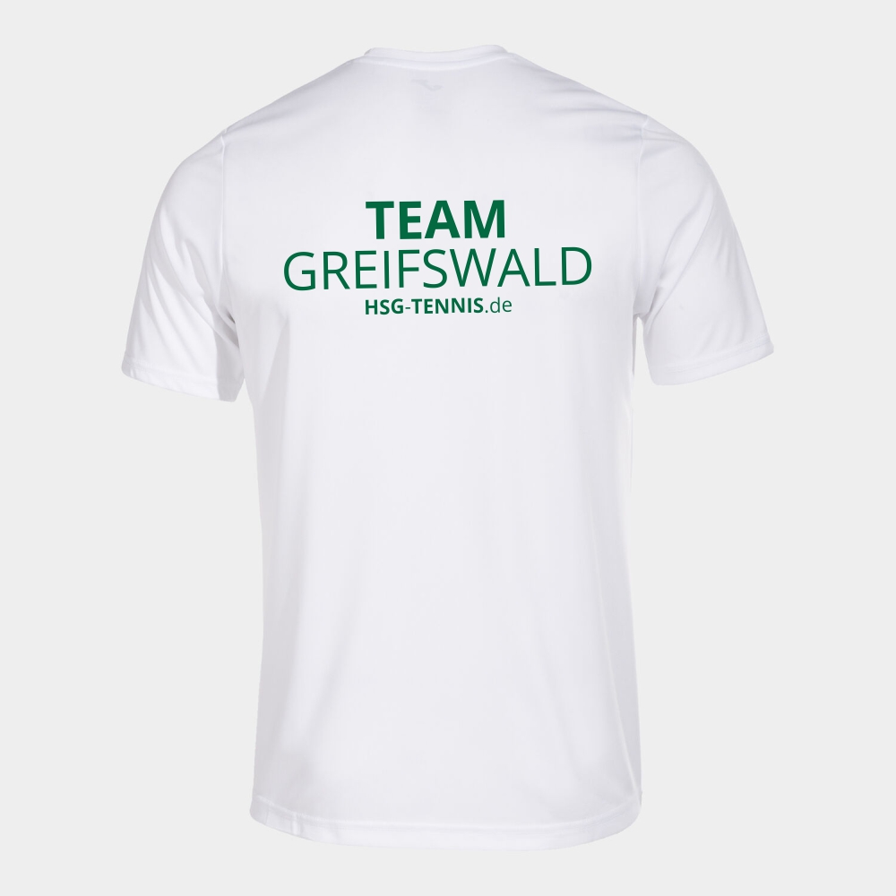 - Rückseite: Optionaler Schriftzug „TEAM GREIFSWALD“ in Grün, ergänzt durch HSG-TENNIS.de in kleinerer Schrift.
